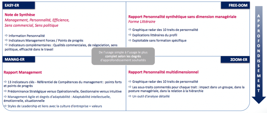 Jusque-là, il s’agit donc d’un inventaire plutôt classique. Ce qui en fait à la fois son originalité ainsi que sa force, ce sont les quatre rapports qui peuvent être mis à disposition de l’évalué ou du professionnel RH :