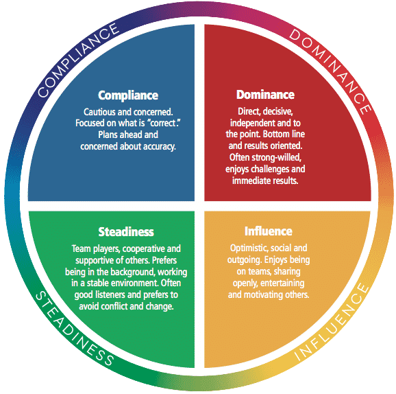 De manière concrète, le DISC est un questionnaire composé de vingt-cinq items. L’objectif est de déterminer le profil des personnes évaluées selon quatre dimensions : Dominance (D), Influence (I), Stabilité (S) et Conformité (C).